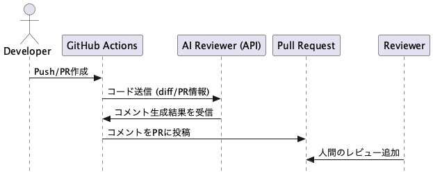 まず、CI/CDパイプラインにおいてAIレビューをどこに配置するかを定義する必要がある。以下にその代表的な構成を示す。