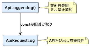 @Reviewerlog()呼び出し側の契約でnull禁止とし、引数をconst参照で受け取る設計に統一してください。例外多発を避け、契約側でヌル不許容を表現しましょう。