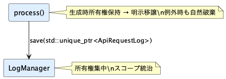 auto log = std::make_unique<ApiRequestLog>();良くない実装例: ケース2(所有権浮遊型設計)
