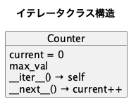 return self.currentこの設計では、状態(self.current)を持った反復可能オブジェクトを提供している。