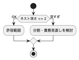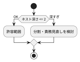 レビューアーがネスト構造を見る際、まず意識すべきは「人間が追える構造かどうか」である。一般的には3段以上のネスト構造は読解負荷が急激に高まるとされている。