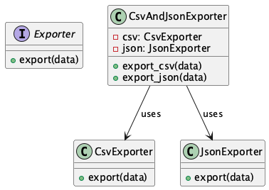 この図では、CsvAndJsonExporter が委譲によって CsvExporter と JsonExporter を利用しています。継承ではなく委譲を用いることで、責務の明示性が向上しています。